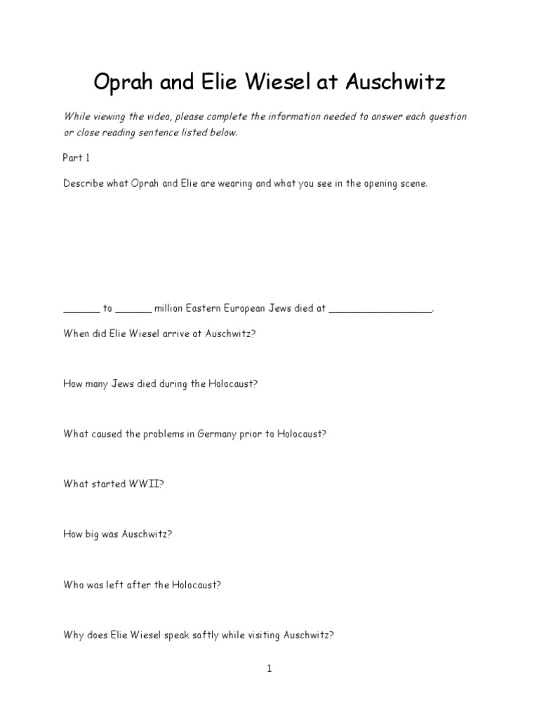 This sheet is due at the completion of the video. Oprah and Elie Wiesel at Auschwitz Worksheet Answer Key as Well as Night Elie Wiesel Plete Printable Student Study Questions. Number of people who died at Auschwitz.